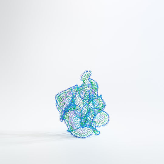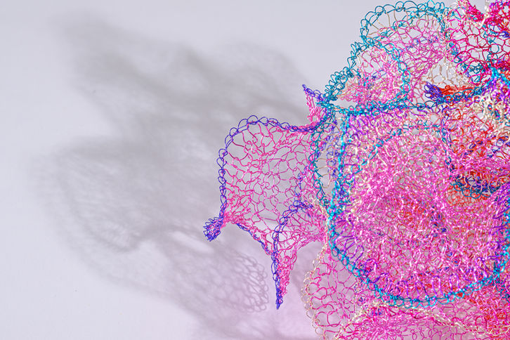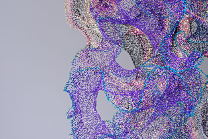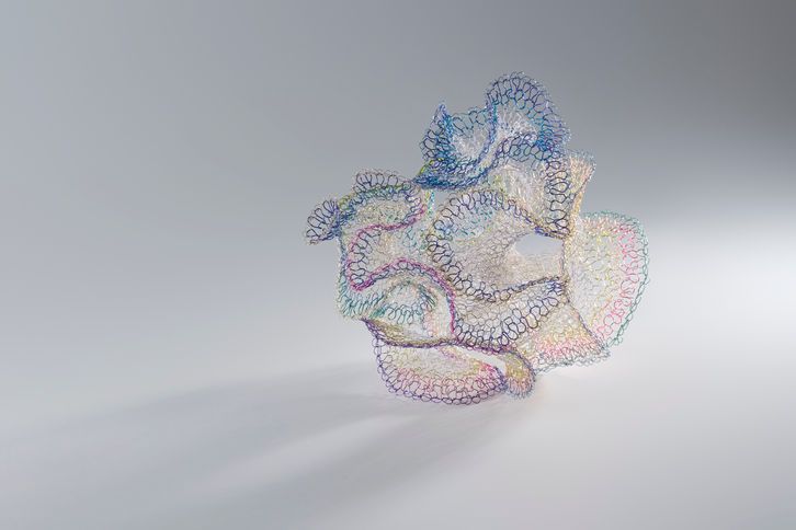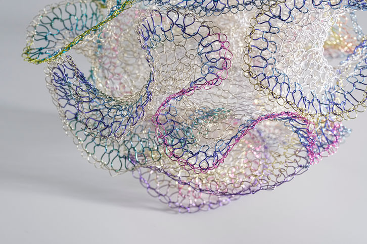 As a sculptor, Hung uses crocheting techniques which she learned at a young age from her grandmother to carefully weave stiff metal fibers into silky, organic forms. Her net-like creations, which radiate warmth from every knotted strand of bright, translucent copper, exude a unique sense of space, as if encapsulating an entire self-sufficient microcosm. At the outset of the creative process, she simply follows her instincts, without a desired form in mind, weaving over and over in seemingly random fashion until each piece comes to life. It is only at the end of this process that the artist appears to have been guided by an unconscious, latent design, each creative decision predetermined by an unseen blueprint. Beginning, middle, and end—ordinarily considered an immutably linear sequence—are thus blurred, inspiring Hung to transcend the three-dimensional and contemplate the existence of free will and the possibility of non-linear time. Throughout the series runs a fundamental question: does the creative process have the power to tap into déjà vu? If it indeed mingles the familiar with the unfamiliar, why can it not ‘reconstruct’ future recollections?