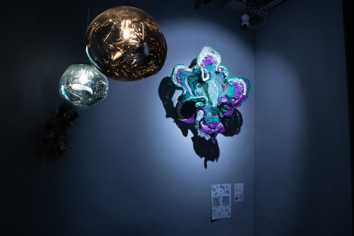Hung crochets post-consumer wastes into organic shapes that abstractly resemble sea creatures. The vivid colors are alternated with blocks of white to represent the phenomena of coral bleaching. At the same time, to re-examine how human beings are affected by today’s standardized culture and losing our own unique colors. The artificial material of used PET bottle, plastic bag, and clothing are cut into strips and then crocheted into a sculpture without any adhesive. Hung learns the crocheting technique from her grandmother when she was little. The crocheting process is also healing and meditative for the artist. To echo the Debris theme, The artist leaves the buttons and labels from the old clothing to let them appear on the sculpture to showcase the material and the emotional connection with human.