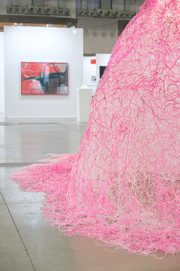 在《不定的粉紅》裝置中,洪郁雯探索刻板印象的流動性,並挑戰預設觀念。作品看似用線編織成水波紋,實則由透明環氧樹脂連結。藝術家以此重新拆解了與女性勞動緊密相關的手工編織,同時對既有的刻板印象提出疑問。